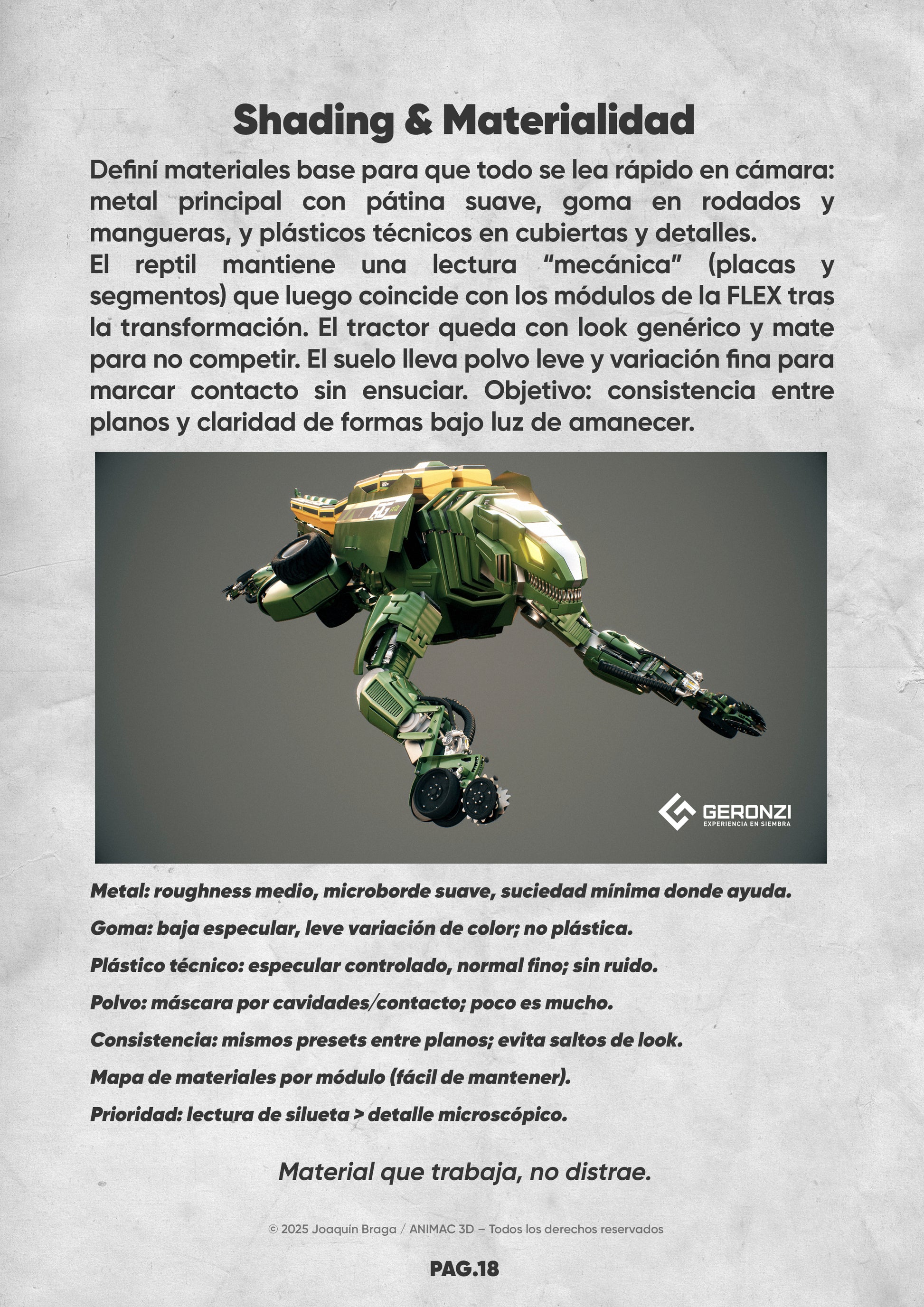 - Look-Dev: materiales (metal/plásticos), desgaste, suciedad y coherencia de color.